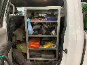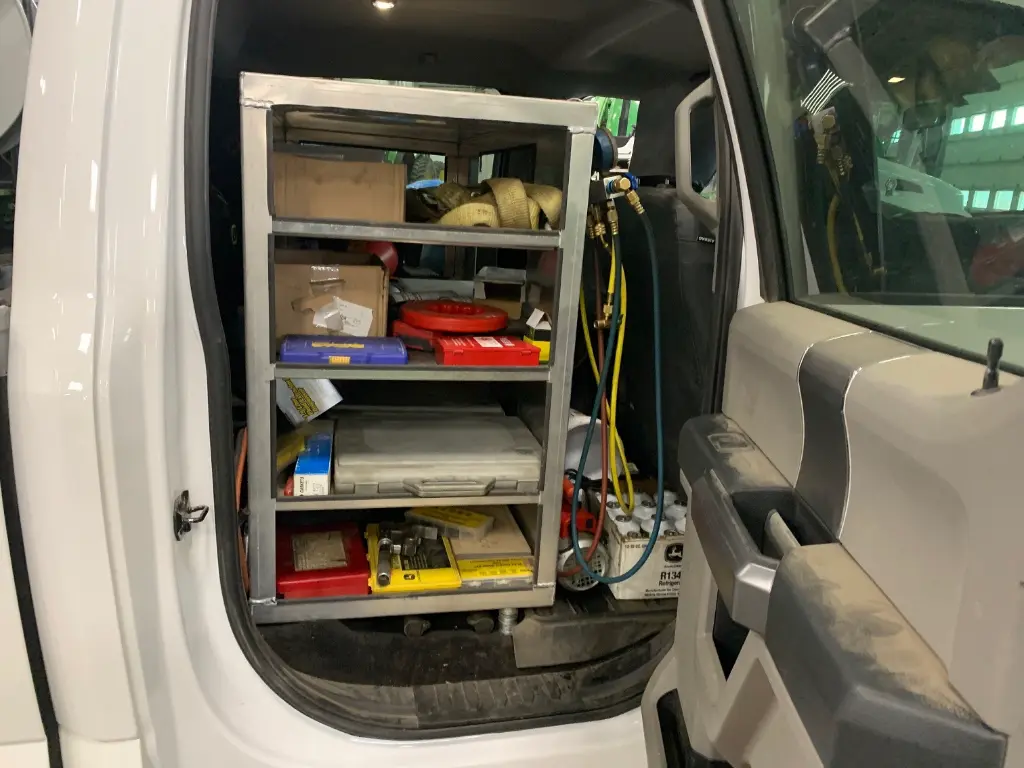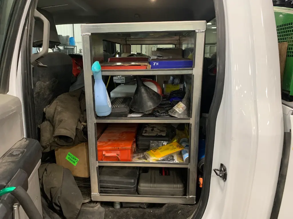 A-PT41 - 36" Height x 55" Depth x 22" Width - .090 Aluminum Heavy Duty Pickup Cab Storage Shelf, All Smooth Finish, Middel Cutout 55" Between the Seats for easy reach and 3 Welded Shelves.